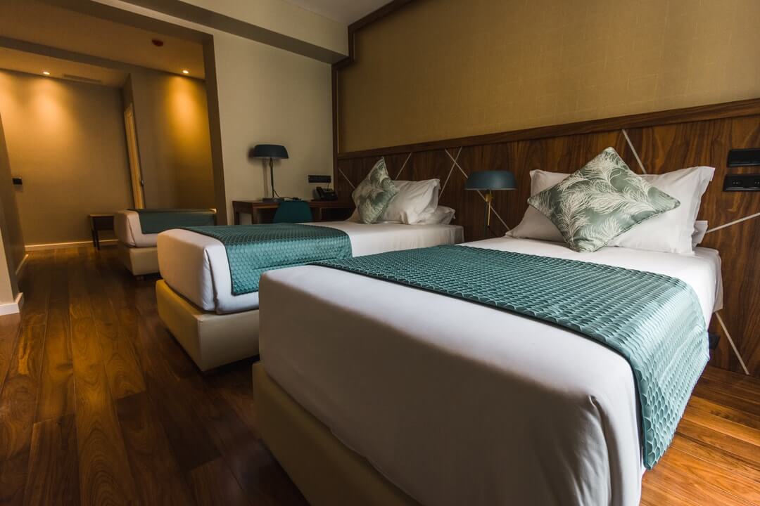 O nosso quarto triplo vem com três camas individuais ou com uma cama King Size e uma cama de individual, tornando-o ideal para pais com filhos ou para apenas um grupo de amigos. Inclui uma casa de banho privada, acesso Wi-Fi gratuito, ar condicionado, serviço de limpeza, uma televisão LED com canais por cabo, entre muitas outras comodidades.